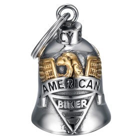 Small "AMERICAN BIKER" ,"LIVE TO RIDE" lucky bell for motorcycles in 316L stainless steel with a chrome and fine gold finish.