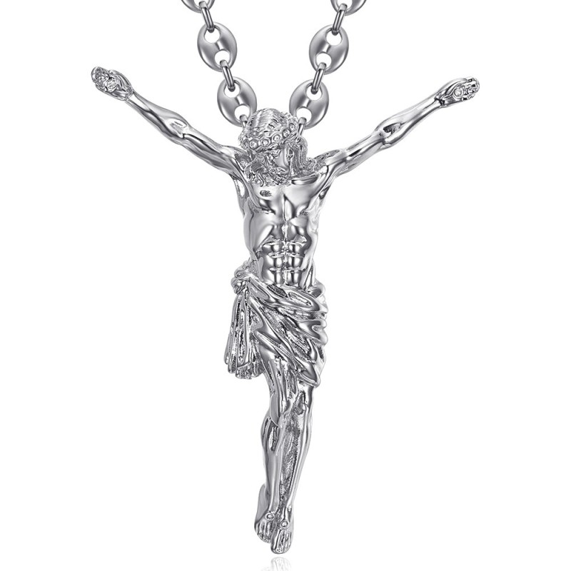 A large Lord Christ pendant in silver-plated stainless steel, this unique creation stands out for the absence of the traditional cross, offering a modern and elegant interpretation of the Christian symbol. The pendant is delicately adorned with zirconium rhinestones on the crown, feet and hands, adding a subtle, refined sparkle.