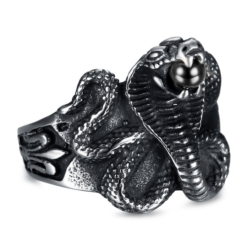 Snake, Cobra, fleur-de-lis and black stone of power ring, a men's jewel in stainless steel