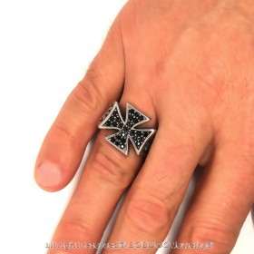 El Anillo de sellar de la Cruz Pattee Rhinestone Negro Fleur-de-Lys