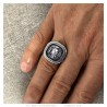 Este anillo de sello con forma de león está fabricado en el mejor acero inoxidable con acabado plateado y negro.