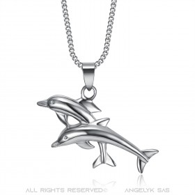 Collar colgante para mujer que representa a una pareja de simpáticos delfines elaborado finamente en un hermoso acero de calidad superior.