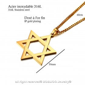 Colgante acabado brillante de 50 mm de acero inoxidable dorado con oro fino (chapado en oro, 2 micrones), que representa a la estrella de David.