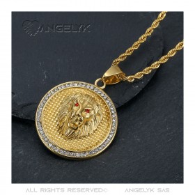 Colgante de león Cabeza de medallón Acero inoxidable Oro Diamante Rubí