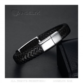 La mezcla de bienes de cuero negro y acero inoxidable esta impresionante pulsera patriótica fleur-de-lys.