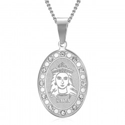 Pendentif médaille ovale de Sainte Sara en acier inoxydable argenté, avec chaîne de 45 cm. Exprimez votre dévotion avec élégance.Vous devez être connecté à votre compte client- 19,90 €