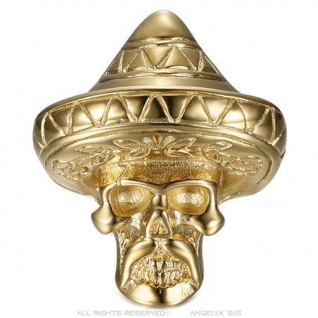 Bague biker mexicain Sombrero Skull Acier inoxydable Or