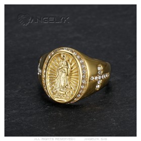 Anello della Vergine Maria Sara e Croce Acciaio Oro Diamanti