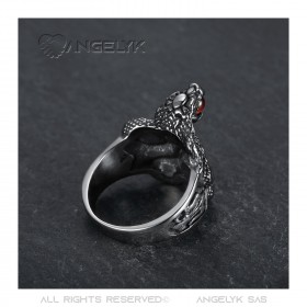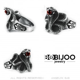 Anello serpente Cobra Sfera di pietra rossa Acciaio Fleur-de-lys