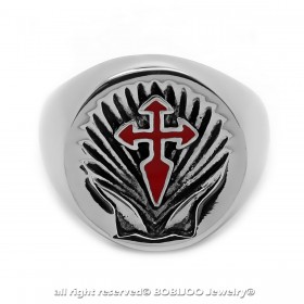 Nous vous présentons cette magnifique bague chevalière Saint Jacques de Compostelle ornée de la croix épée rouge.