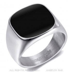 Chevalière Bague Cabochon Noir Email Homme Acier Inoxydable 316L Argenté