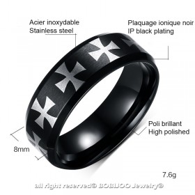 Une jolie bague noire ornée de croix templières argentées sur tout le tour. Sa largeur est de 8mm. Elle est acier inoxydable plaquée noire ionisée d'une très belle qualité. Cette bague croix des templiers est très confortable grâce à sa finition intérieure polie.