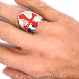 Bague Chevalière Homme Bouclier des Templiers Croix Rouge Argenté Acier Inox