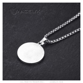 Pendentif Yin Yang en acier inoxydable argenté, représentant le symbole de la dualité et de l'harmonie. Cet accessoire élégant et significatif mesure 26 mm de diamètre et 3 mm d'épaisseur. La chaîne de 55 cm est incluse, ce qui en fait un ensemble complet prêt à porter.