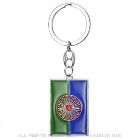 Porte clé du drapeau gitan rom signé Bobijoo en métal argenté et émaillé avec les couleurs officielles.
